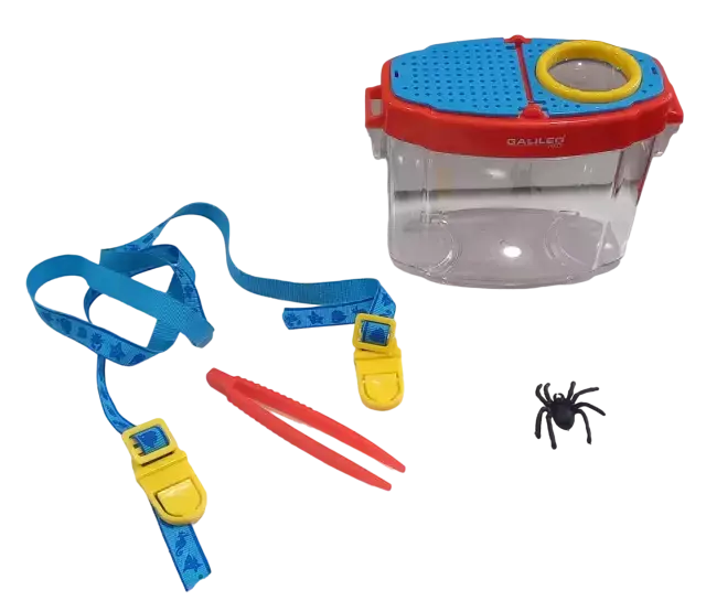 El set completo contiene: - Tapa combinada con lupa y orificios para diferentes tipos de observación - Contenedor/portaobjetos con correa para fácil transporte - Pinza de sujeción para manipular muestras con precisión