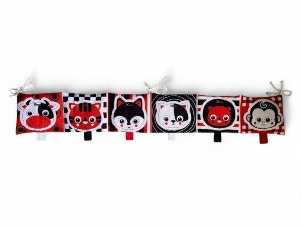 Este libro de tela desplegable en colores rojo, blanco y negro está especialmente diseñado para estimular la visión y la atención de los bebés desde sus primeros meses. Los contrastes marcados y las formas simples capturan la mirada de los más pequeños, favoreciendo el reconocimiento visual y la concentración.