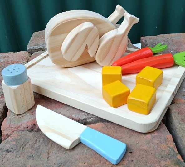 Pollo con verduras de madera, ideales para el juego simbólico.