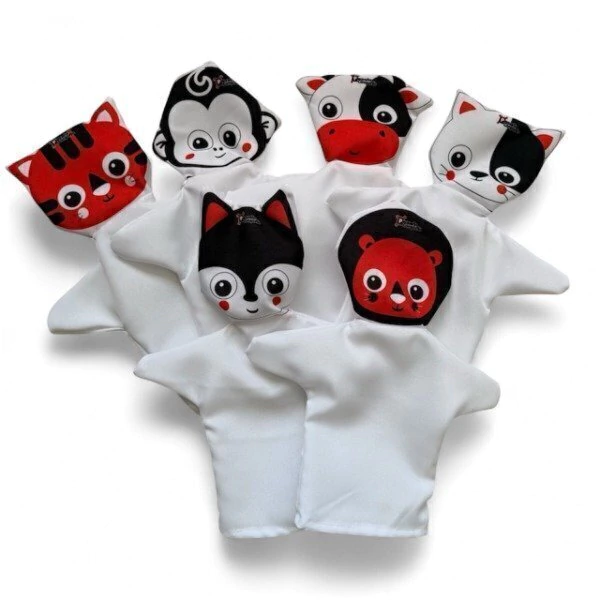 Titeres manopla animales en alto contraste. Modelos: zorro, mono, vaca, tigre, leon, gato.