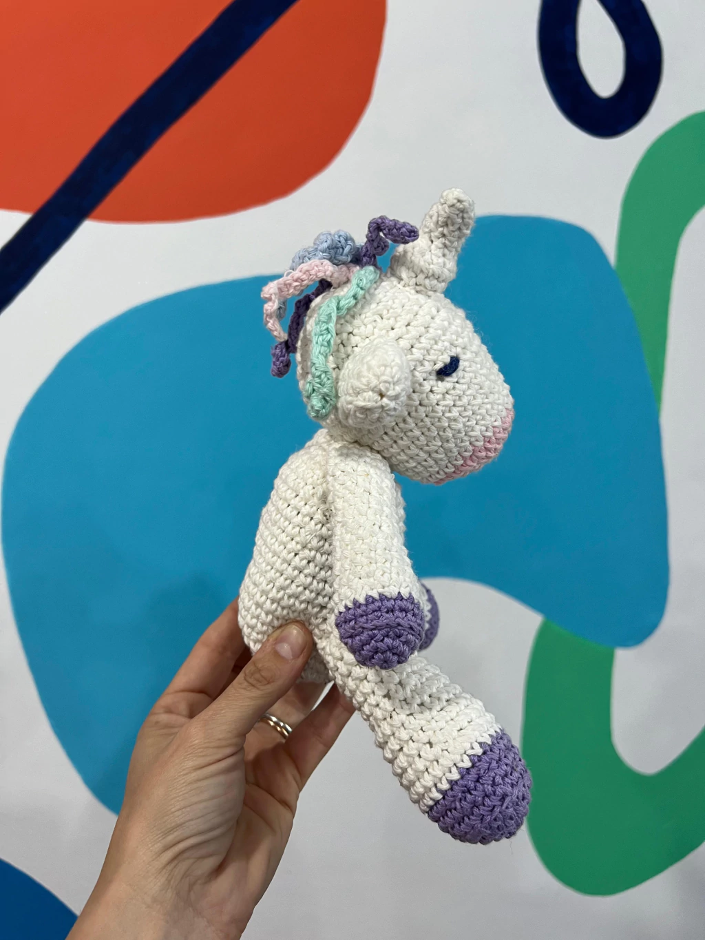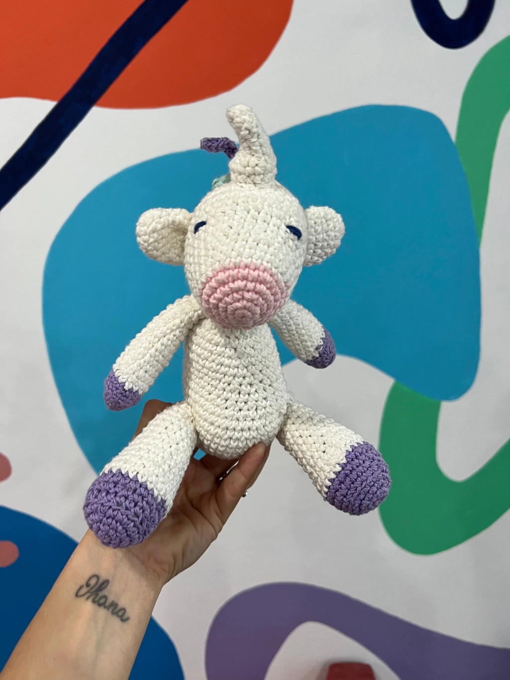 Este Unicornio tejido a crochet artesanal es un tierno compañero para los más pequeños. Con medidas aproximadas de 20 a 24 cm, este Unicornio es ideal para estimular la primera infancia, ofreciendo beneficios como el desarrollo de la motricidad fina y el vínculo afectivo.